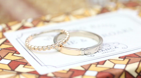 『FLAT』リングと『Floret』リングのマリッジリング。 ピンクゴールドとホワイトゴールドのコンビネーションにカスタムオーダーです。 メンズはホワイトゴールドをベースに帯の部分はピンクゴールド。...