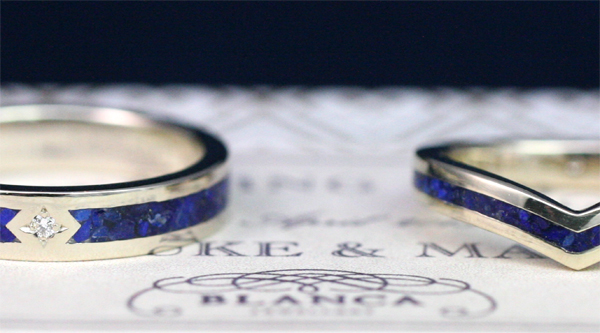 - 先日納品した『STONE』リングの結婚指輪です。 青い石は、ラピスラズリ。 ラピスラズリの青は、はっとするほど鮮やかで毎回見とれてしまいます。 メンズはトップに、レディースは手のひら側に メレダイヤ...
