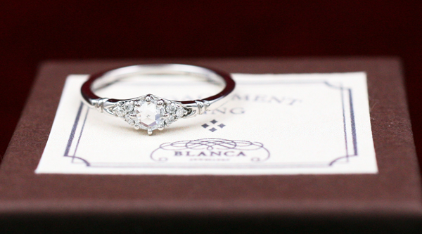 先にマリッジを納品したお客様のエンゲージリングです。 ぷっくらとした厚みのある これこそがローズカットダイヤモンド。 今ある在庫の中から上質で大きなものを選んでいただきました。 サイドにはメレダイヤ...