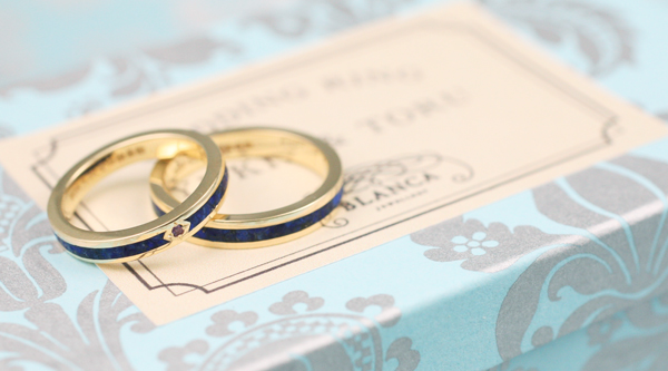- 天然石の色が楽しめる『STONE ring』の結婚指輪。 14kt YGに新婦の誕生石のラピスラズリ、 新婦の指輪にはアメジストを一粒、とのご依頼です。 刻印は日付と互いの名前を漢字で刻み、 名前の...