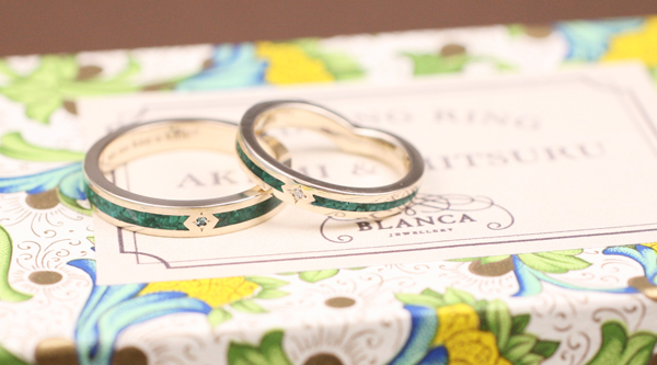 - 『STONE ring』のマリッジリング。 美しいグリーンはマラカイトです。 メンズに留めたパライバトルマリンは女性の、 レディースに留めたダイアモンドは男性の誕生石。 刻印はの意味は「今もこれから...