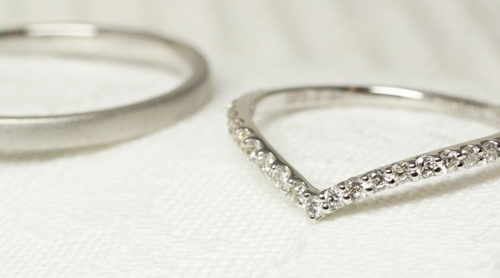 - プラチナの結婚指輪です。 メンズはシンプルなフラットリング。 レディースはV Shaped Diamond Ringのスペシャルカスタムオーダー。 ひと粒ダイヤの婚約指輪との重ね着けがかわいい!と ...