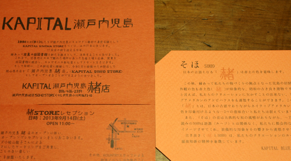 - 2013年9月15日 岡山の児島に、KAPITALの新しい試みの詰まった店舗がオープンします。 店の名前はキャピタル瀬戸内児島「そほ」店。 そのグランドオープンに合わせて BLANCA+K新作のギャ...